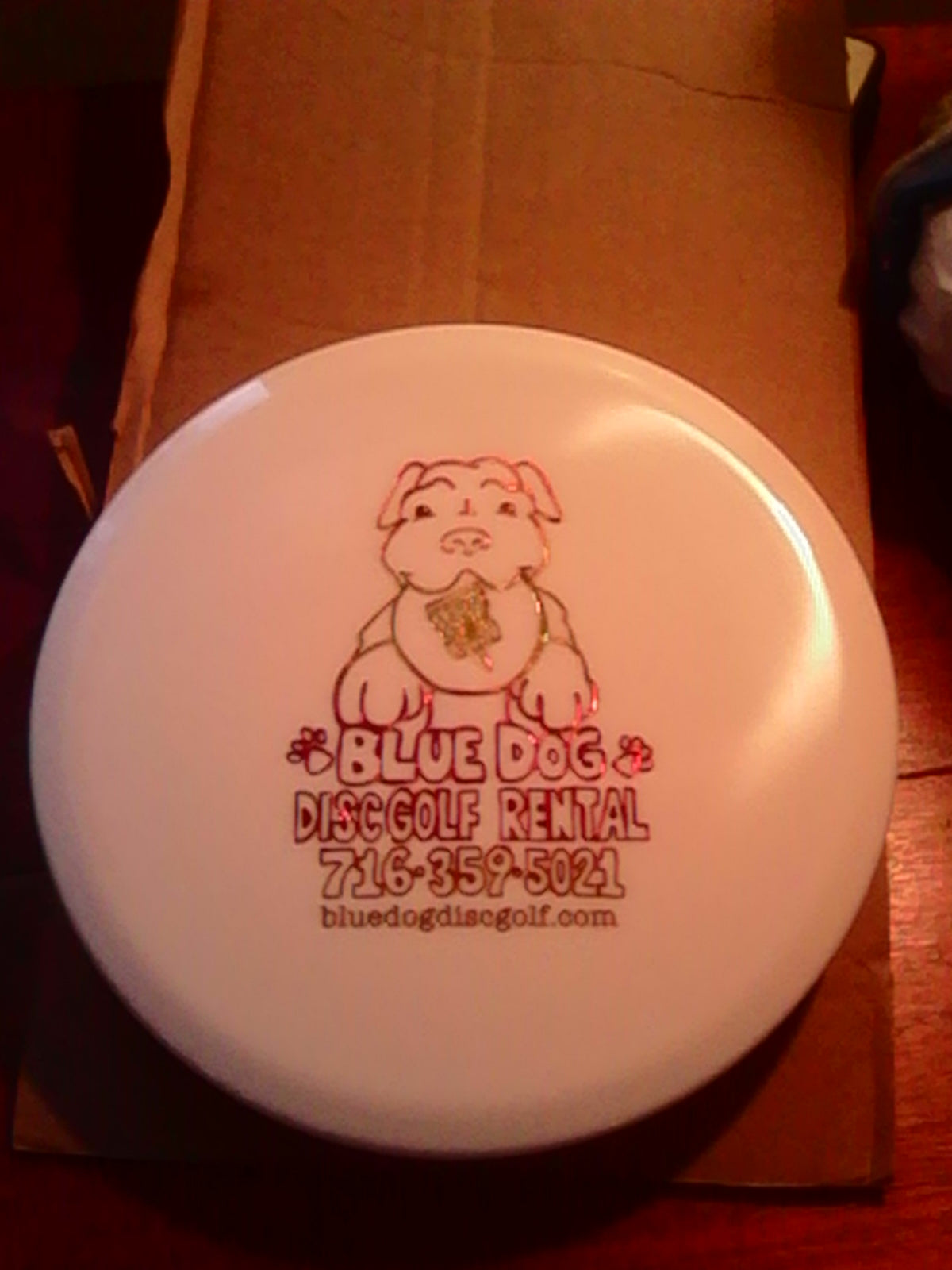 Winter white disc with a metallic multi colored stamp. Awesome.